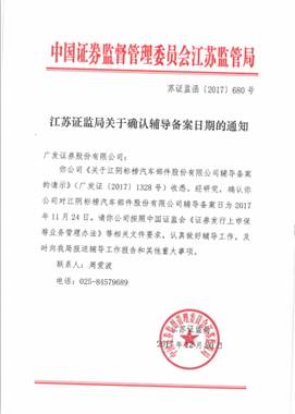 公司已收到江蘇證監(jiān)局關(guān)于確認輔導(dǎo)備案日期的通知,公司將會按照中國證監(jiān)會《證券發(fā)行上市保薦業(yè)務(wù)管理辦法》等相關(guān)文件要求,認真做好輔導(dǎo)工作,及時向江蘇證監(jiān)局報送輔導(dǎo)工作報告和其他重大事項。